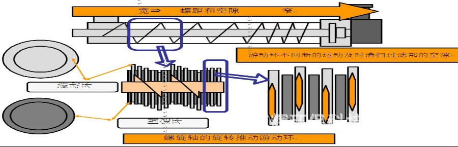 以上图像示意叠螺主体由固定环和活动环相互重叠组成,前段为浓缩过滤,后段为挤压出泥。螺旋轴贯穿其中并带动环片中的活动环转动从而达到逐步脱水的目的,螺旋轴的间隙不断减小,使得其中压力不断增强,使其充分脱水。达到降低含水量出泥的目标,同时在环片转动挤压的过程中也起到了清洗环片的作用。