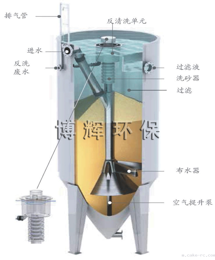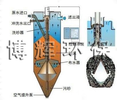 原水通过入水管进入活性砂过滤器中,经布水器均匀分布后逆流向上通过滤床并由滤液排放口排出。底部截流有污染物的滤料由空气提升泵提升至位于过滤器顶部的洗砂器,清洗后返回滤床上表面,进入下一个循环,滤料清洗用水直接取自过滤器内滤出液,不需专设清洗用水。